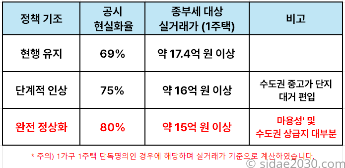 - 정상화(현실화율 80%): 실거래가 약 15억 원만 넘어도 종부세 대상